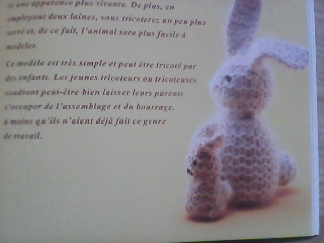 Voici enfin le dernier livre qui sert aussi pour les enfants : Doux animaux trocotés d'Anne - Dorthe Grigaff. Comme le titre l'indique il s'agit d'apprendre à tricoter des animaux. Mais cette fois pas de choses compliquées, la plupart du temps on utilise le point mousse ou le jersey, les augmentations et les diminutions. Des schémas clairs sont donnés pour les animaux un peu délicats comme le cheval. Les chutes de laines peuvent suffire, du bourrage, une aiguille pour assembler et parfois un petit morceau de quelque chose mais on peut faire autrement. Le livre débute par quelques recommandations quant à l'apprentissage du tricot puis enchaîne sur des explications concernant les fournitures et techniques. Puis arrivent les modèles : la cane et ses canetons, l'ours, le mouton et son agneau, un ours en peluche, des chats, des chiens, un écureuil, une oie, le lièvre, le cheval, le lapin, des poussins et des poules et le coq, le renard, la truie et ses petits, un autre modèle de chien, le hérisson, une petite souris de poche. Voici quelques photos qui illustrent les modèles :